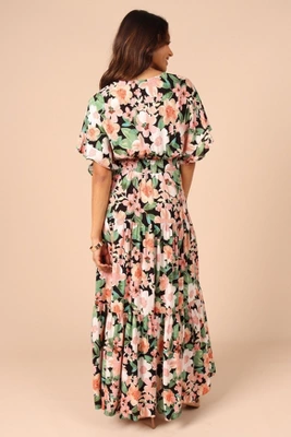 We are loving our new maxi length V-neck dress with button clasp closure. Featuring an elasticised waistband and functional pockets, this dress is perfect for any occasion. The short sleeves have a playful ruffle cuff, while the tiered gathered skirt panels give it that extra touch of femininity.