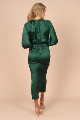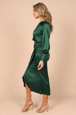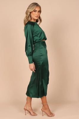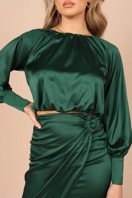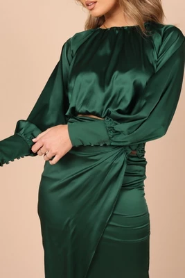 This matching top and skirt set is the perfect choice for your next event! From its cropped length top with a round neckline and long sleeves with button cuff close, to its midi length skirt with front wrap detail, back invisible zip and hook and eye clasp, you’ll look stunningly elegant. Not to mention the subtle sheen of satin finish that will give your outfit an extra touch of flair!