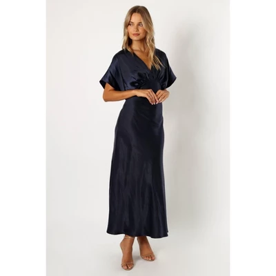 This elegant maxi dress is the perfect choice for any special occasion. It features a v neckline with clasp close, short butterfly sleeve and a side invisible zip with hook and eye clasp for an easy fit. The satin fabric has a soft feel that will make you look and feel fabulous all night long.