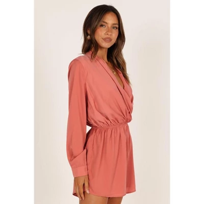 Look chic and feel comfortable in this dreamy, deep overlay playsuit. With a flattering v neckline and long sleeves with functional button close, you will look stylish all day long. The back features a keyhole cut out closure with a functional button to create the perfect silhouette.